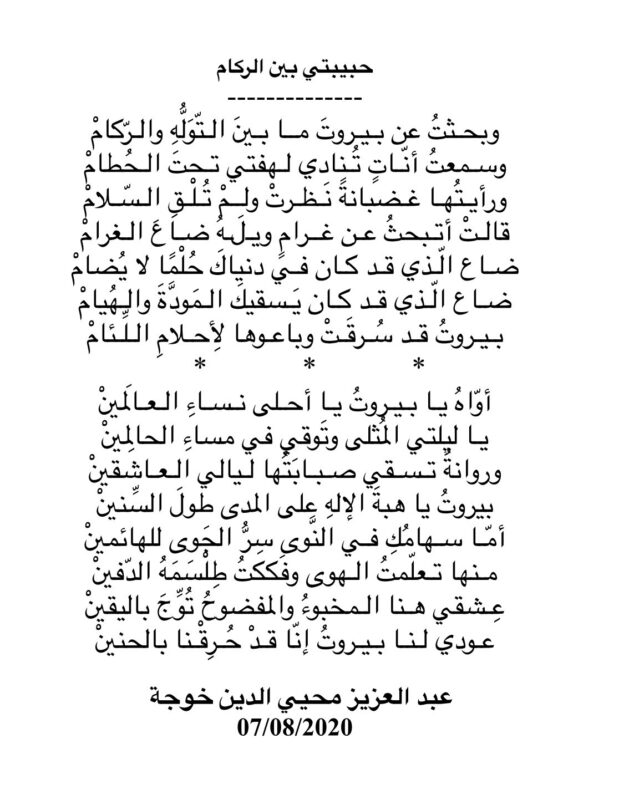 من جمال الحرف ورقي الفكر ان يسلط الضوء كوكبة من المثقفين ورجال الفكر والاعلام منهم الاخ العزيز الاستاذ محمد حامد الجحدلي على قصيدة لمعالي الدكتور عبدالعزيز خوجة الذي عاش زمنا في لبنان سفيرا للمملكة العربية السعودية خلال الفترة الذهبية و عزة لبنان و وهجها ثقافيا واقتصاديا فترة المرحوم الرئيس رفيق الحريري وفعلا لقد ابكتنا القصيدة و ما تحمل من الالم بين حروفها وكلماتها حيث كتبها معالي الدكتور عبدالعزيز خوجة ونحن جميعا نتألم لما نرى بما حل بلبنان التي كانت يوما تلقب سويسرا الشرق و كانت منار للعلم والمعرفة والادب فرحماك يالله بلبنان ارضا وشعبا.